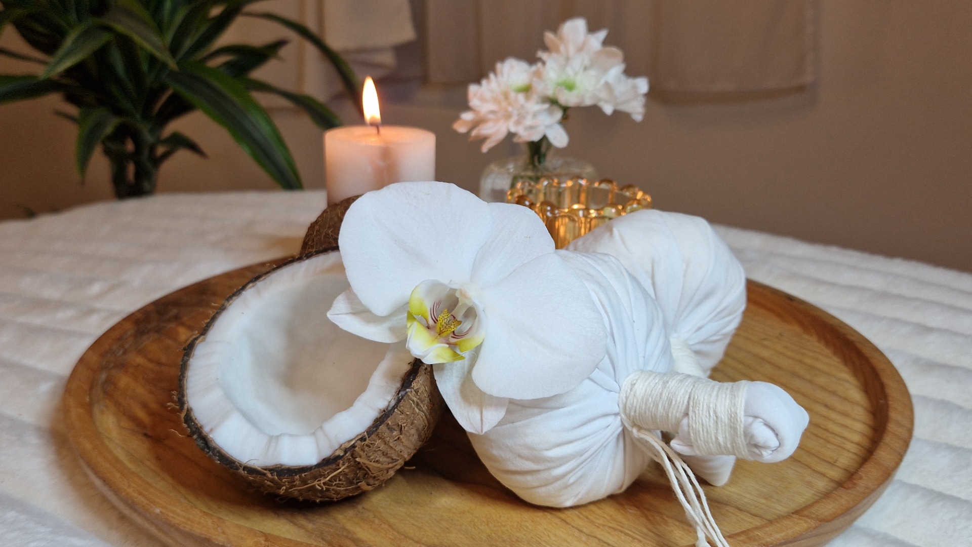 Luxusní masáž teplými kokosovými měšci s liftingovým zábalem